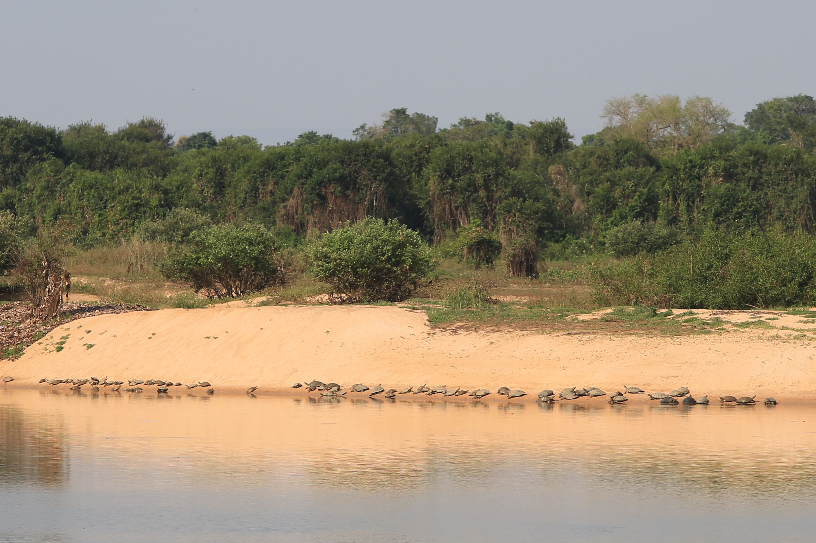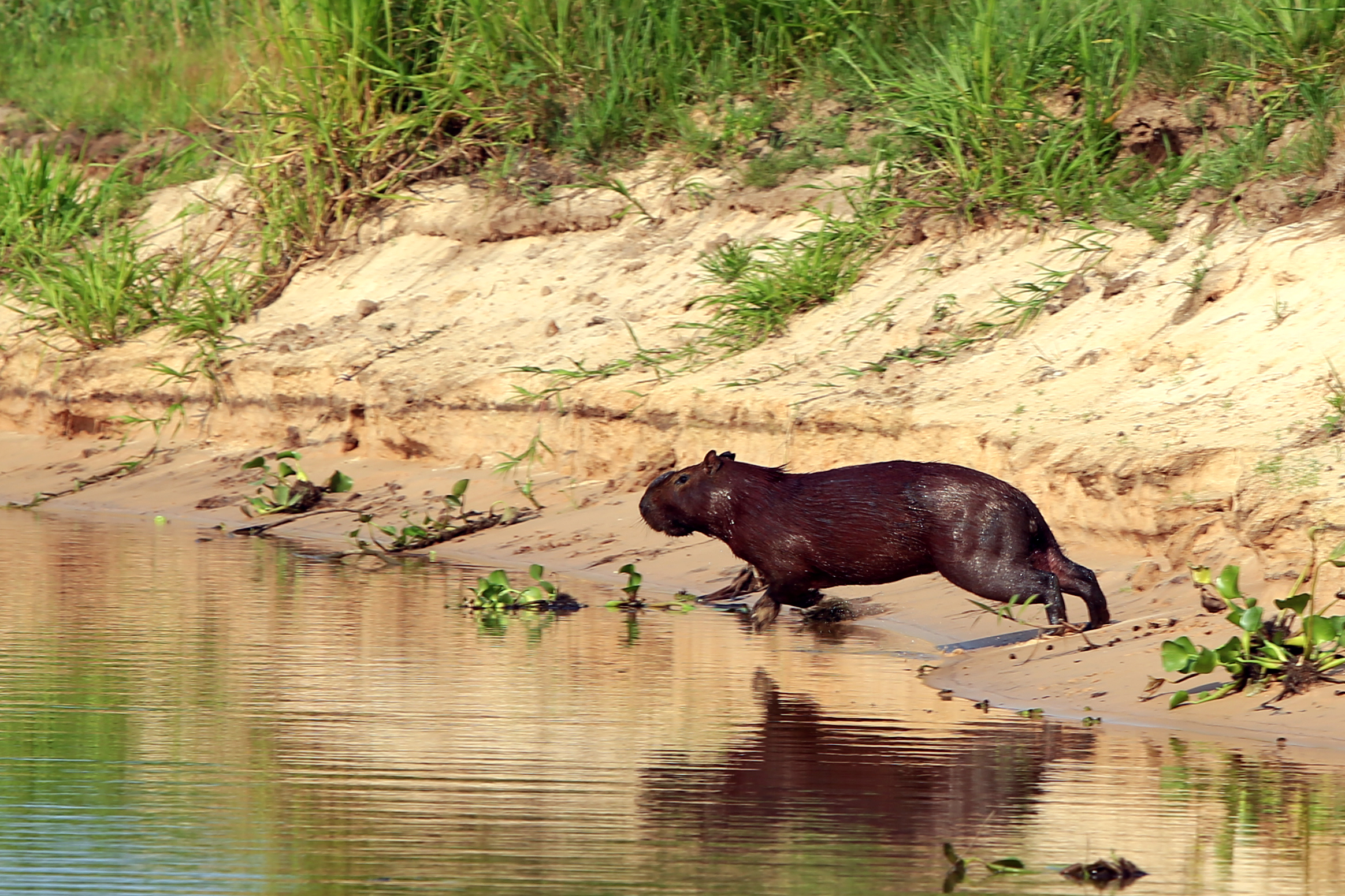 The day started off rather slowly. We had an early morning wake-up as usual, but the river was really shallow so we stayed on the big boat a bit longer while we attempted to find the channels in the river. Vagno was needed on the bigger boat to help guide and, at one point, I saw he was in the motorboat alongside us, with a big wooden pole that was definitely touching the ground. Several times our boat had to turn off its engines and shudder through the sandy areas in order to make it through. It is amazing how much the water has receded in less than a week since our journey out to the reserve. Some of the different side waterways were completely impassable only a few days after we had spent time perusing them. Douglas said that the river water this year is actually unusually high for September as this winter they had what Douglas refers to as the “Fifty Year Flood”. In fact, the numbers of capybara and jaguar are way down compared to normal and he thinks its because the animals had to go farther away during the flooding this year, and that maybe they haven´t made their way back yet.