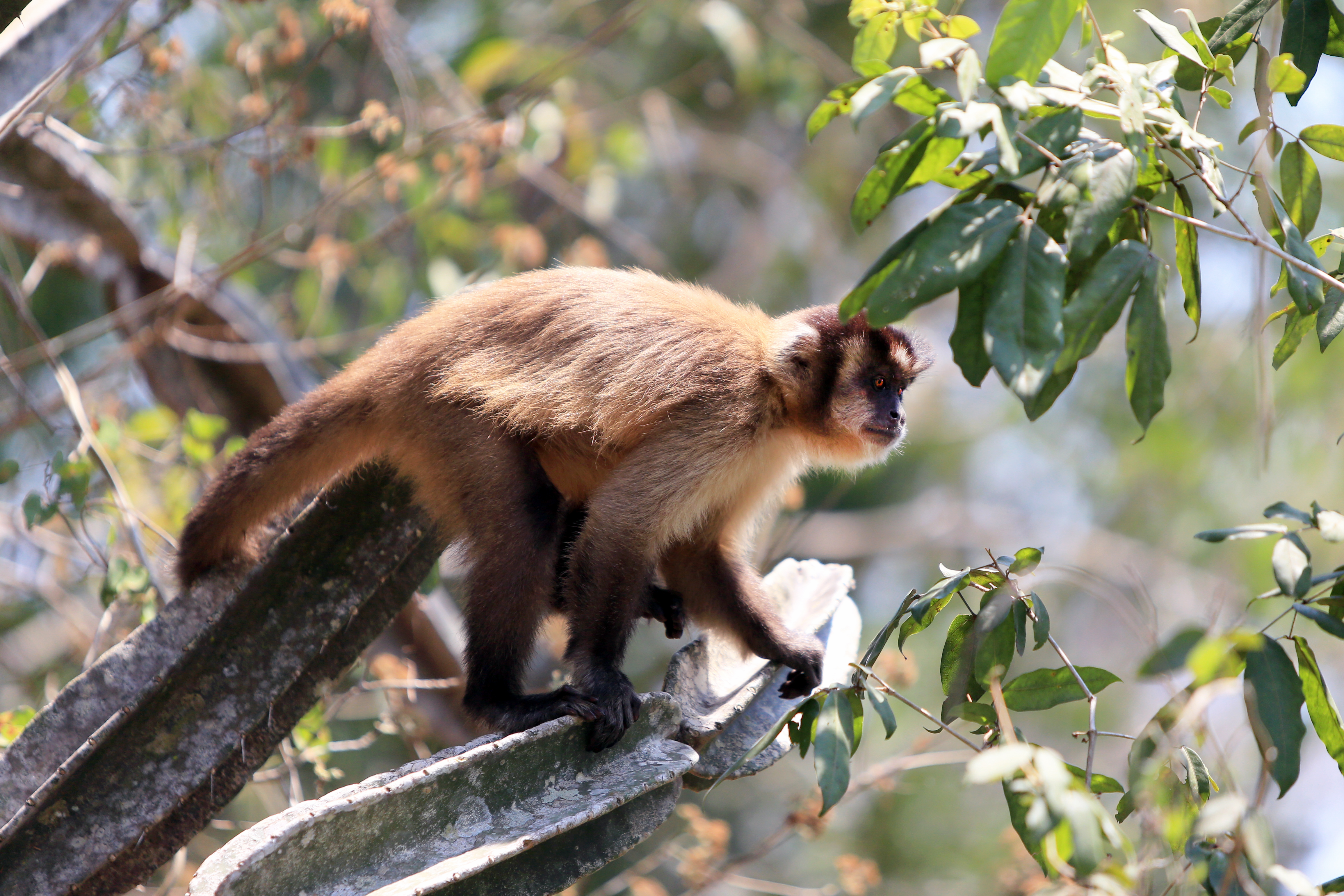 After our morning looking for birds we headed back to the same hotel we had passed on our way in to the Pantanal. We were hoping that the monkeys and the wild pigs were there, feeding on corn. Well, there were no pigs, but we could definitely hear the monkeys in full effect. As we climbed the embankment into the forest, we could tell there were about forty capuccin monkeys in the treetops around the hotel. They were amazingly human-like and very agile as they jumped from tree to tree. I saw one monkey lying down across its partner´s lap, and the other was petting its head, just like a human couple might do. I was pretty obsessed with the monkeys because they were so cute and furry looking with their cappuccino colored faces. I must have watched this one monkey for about 20 minutes as he carefully made his way out of the tree and attempted to approach the corn laid out by the hotel workers. It kept advancing slowly but was staring at me to see if I was going to make a move. If I did, it retreated quickly. Eventually I walked around the corner of the nearest building to see if the monkey would make a break for it and head for the corn while I wasn´t looking. And sure enough, when I peaked my head around the corner there he was gathering the corn up by the armful and laughing with delight. I adored him.